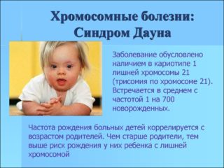 - Среди заболеваний встречается синдром Дауна, который наблюдается при 47 хромосомах (вместо 46). У новорожденных плоское лицо, косые глаза, складка сверху на веках, плоская затылочная часть. Также наблюдаются маленькие уши, пальцы короче обычного, складка поперек ладони. Негативные последствия – в проблемах с сердцем, задержках в развитии, недостатке внимательности.