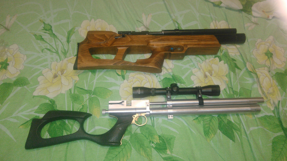 светленькая это по мотивам кроссман 1377. все с нуля. ствол один 15тр. кит плюс кастомная коробка, кастом приклад, кастом рукоять. оптика опять же. резервуаров 2 штуки. вкладной редуктор. модератор плюс глушитель. и это я токарку не считал и другие мелочи