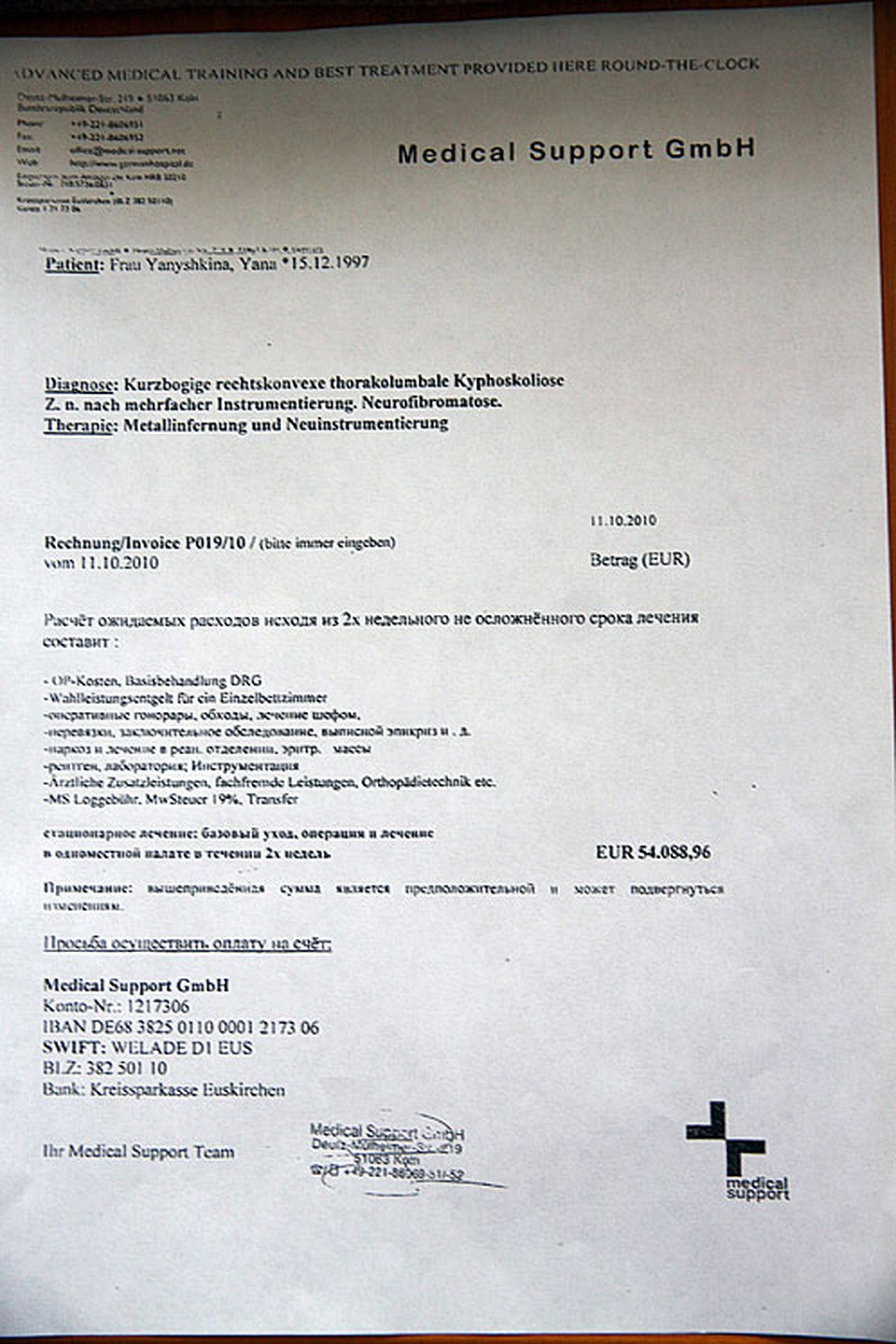 Она родилась обычным ребёнком. В полтора года ей сделали операцию по удалению опухоли в области позвоночника, а в три у Яны начал расти горб. Девочка перенесла уже шесть операций. 10 лет назад в Новосибирске ей установили металлические конструкции для поддержания позвоночника. По мере взросления Яны они то и дело ломаются. Столичные медики посоветовали обратиться к немецким специалистам. В Яна вместе с бабушкой попали на консультацию в Германию. Для операции за границей Янышкиным нужно собрать 54 тысячи евро. Это почти четыре миллиона рублей.