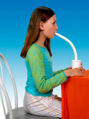 - Устройство ставится вертикально. Мундштук надо поместить в рот и обхватить губами, при этом не надо излишне напрягать мышцы лица;