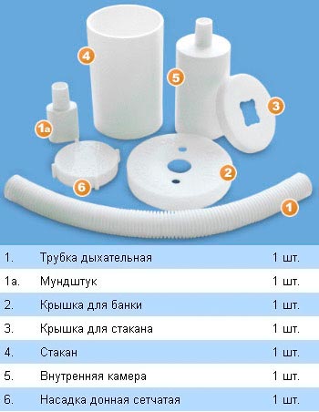 ВНИМАНИЕ! При правильной сборке тренажера внутренняя камера (5) с присоединенной к ней донной сетчатой насадкой (6) плотно стоит на дне стакана (4), не двигаясь вверх и вниз. Крышка (2) для банки во время тренировок дыхания не используется