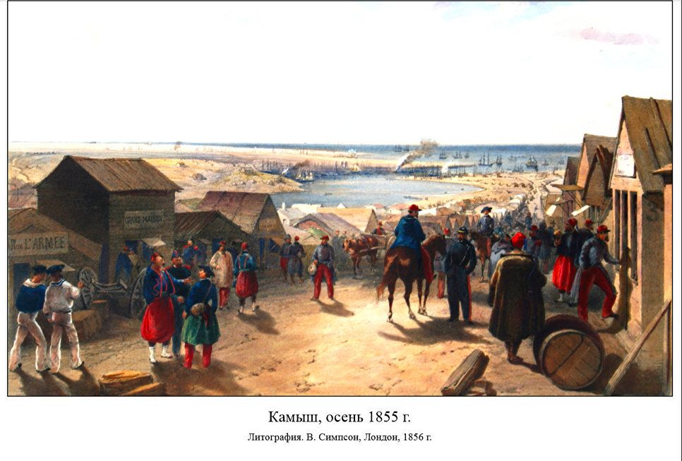 "В Камышовой бухте, как правило, выгружалось все, что отправлялось с французских территорий в помощь войскам. Поблизости были организованы торговые поселки, где купцы из Марселя, Константинополя и Варны жили в деревянных избах и шалашах. Вскоре на берегу бухты возник настоящий французский городок Камьеш, где были свои рестораны, бары, церквушки и даже театр, в котором по некоторым описаниям могло разместиться до 1,8 тыс человек", — рассказал РИА Новости Крым историк и автор книг об истории Севастополя Валерий Иванов.Французское поселение Камьеш. Литография В. Симпсон, Лондон, 1856 год