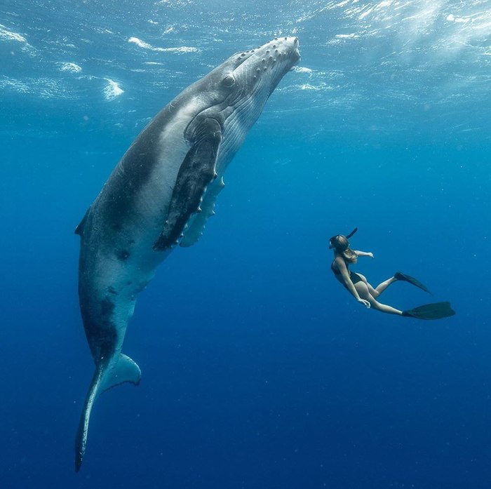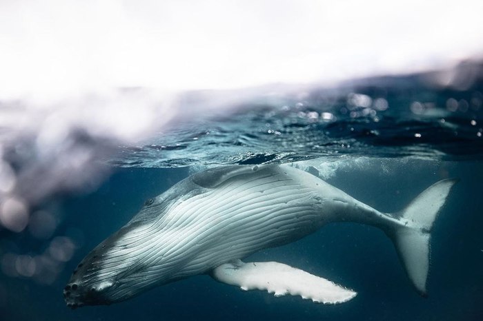 Когда детеныши горбатых китов появляются на свет, их длина составляет от четырех до пяти метров. Меган Джонс из Китового фонда давно наблюдает за самками и их потомством. Детеныш ерзает над и под мамиными плавниками. Когда она задерживается у поверхности, он играет на ее огромной спине: наклоняет ее в разные стороны и скатывается, как c горки. Как и детеныши других млекопитающих, они очень любят ездить на маме. Ученые видели, как горбачи возят на спинах афалин – дельфинов отряда китовых, иногда поднимая их очень высоко.
