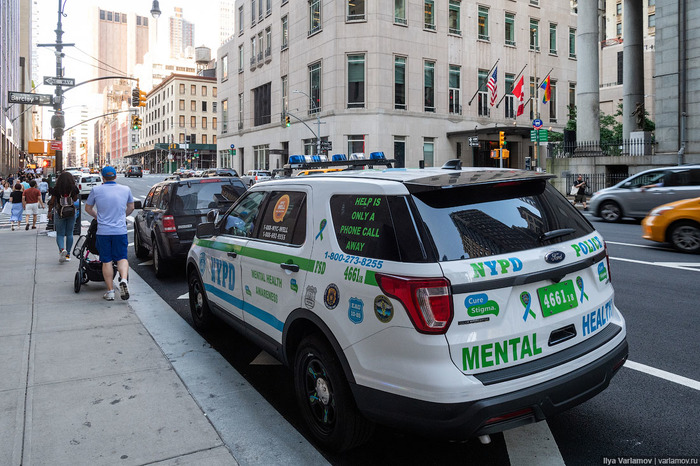 40. Это машина специальной психологической службы, которая помогает полицейским. За последнее время в Нью-Йорке несколько полицейских покончили жизнь самоубийством из-за постоянного стресса на работе, поэтому у нью-йоркской полиции есть свои психологи, помогающие сотрудникам. На вызовы они тоже ездят с мигалками.