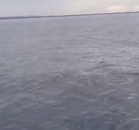 На кадрах видно, как кит выпрыгивает из воды позади лодки, затем уходит обратно под воду. Судно на его фоне кажется крошечным.