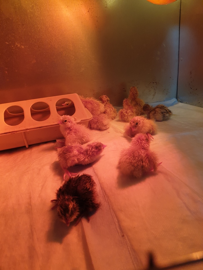 Вот они первые-первые. В первые сутки вылупилось около 30- 33 штук. На вторые сутки стали проклевываться и сидеть, у яиц пленка жесткая. Мы для себя решили, что будем в этот раз им помогать, если пару часов лежит и не смог прорваться. Где то половина из проклюнувшихся была сразу задохликами, а из оставшихся половина вылазила и очухивалась до нормальных птенцов. Вертолетов и шпагатов не связывали, и их либо не было, либо сами восстановились и забегали.