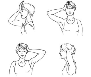 - Ладони кладут на затылок и стараются запрокинуть голову, напрягая передние мышцы шеи.