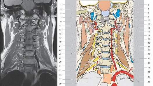 МРТ шейного отдела позвоночника: полулунные отростки (стрелка) в коронарной плоскости (Т2, STIR)