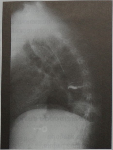 Женщина 60 лет с остеопорозом, контрольная рентгенограмма (через 1 год) по поводу бронхиальной астмы. Боковая проекция. Патологический кифоз грудного отдела позвоночника с компрессионным остеопоротическим переломом позвонка в среднегрудном отделе позвоночника (кифоз вследствие остеопороза).