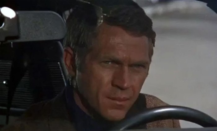 Камера в маслкаре Маккуина передает изображение от первого лица, причем крупными планами. Это сейчас нас не удивить таким приемом, а тогда на большом экране кинотеатра эффект присутствия вызывал у зрителя кинематографический шок. И тут нельзя не отметить филигранную работу оператора Уильяма Фрейкера, которого Йетс сманил у самого Романа Полански.
