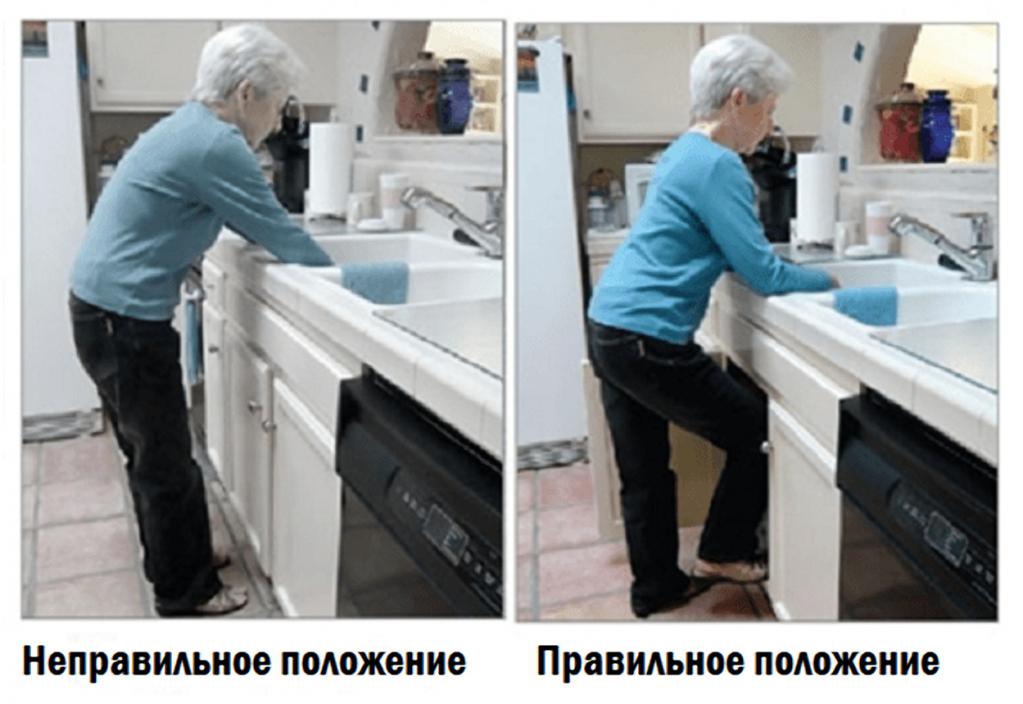 Как избежать: Моя посуду, подставьте под колено табурет или стул — это снизит давление.