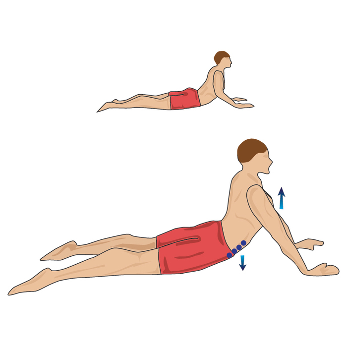- В положении на животе нужно по очереди вытягивать вперед руки и ноги.