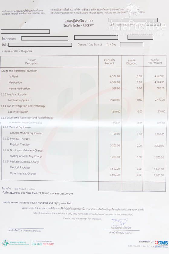 В январе 2012 года в результате падения с мопеда я попала в Бангкок Госпиталь (Bangkok Hospital) на острове Пхукет с серьёзной травмой ноги. Мне оказали первую помощь и попросили внести половину стоимости самостоятельно, так как страховой компании понадобилось несколько дней на согласование с госпиталем всех бюрократических вопросов.