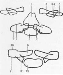 7 — верхняя суставная поверхность Сп; 8 — тело Сн; 9 — пластина дуги; 10 — верхний суставной отросток; 11 — нижний суставной отросток; 12 — ножка дуги; 13 — тело позвонка.