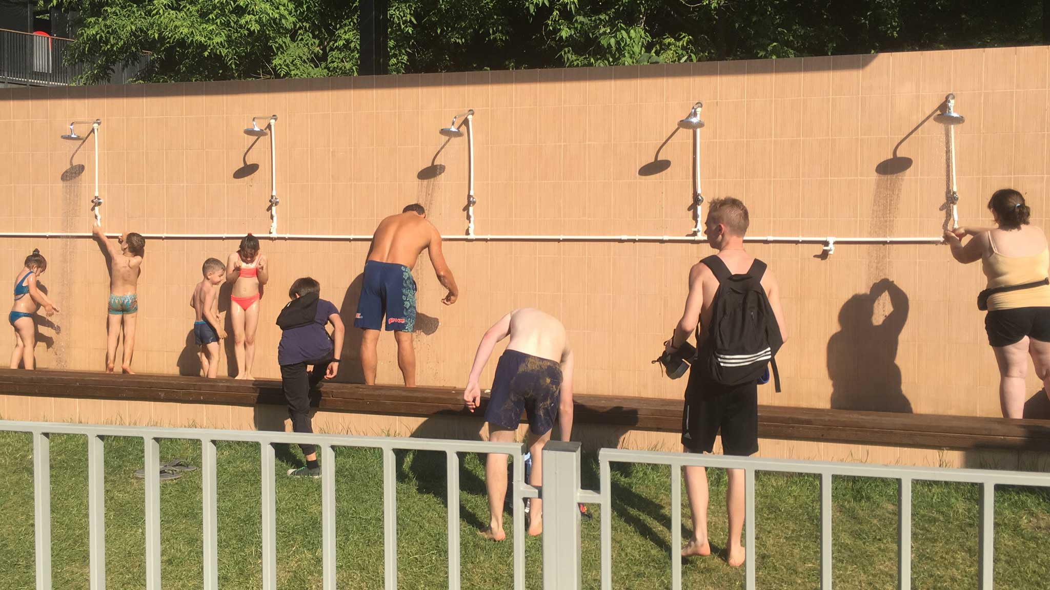 Есть среди посетителей и те, кто не желает заходить в воду. Однако все равно освежается — на пляже есть душ. Лейки открытые, без всяких кабинок.