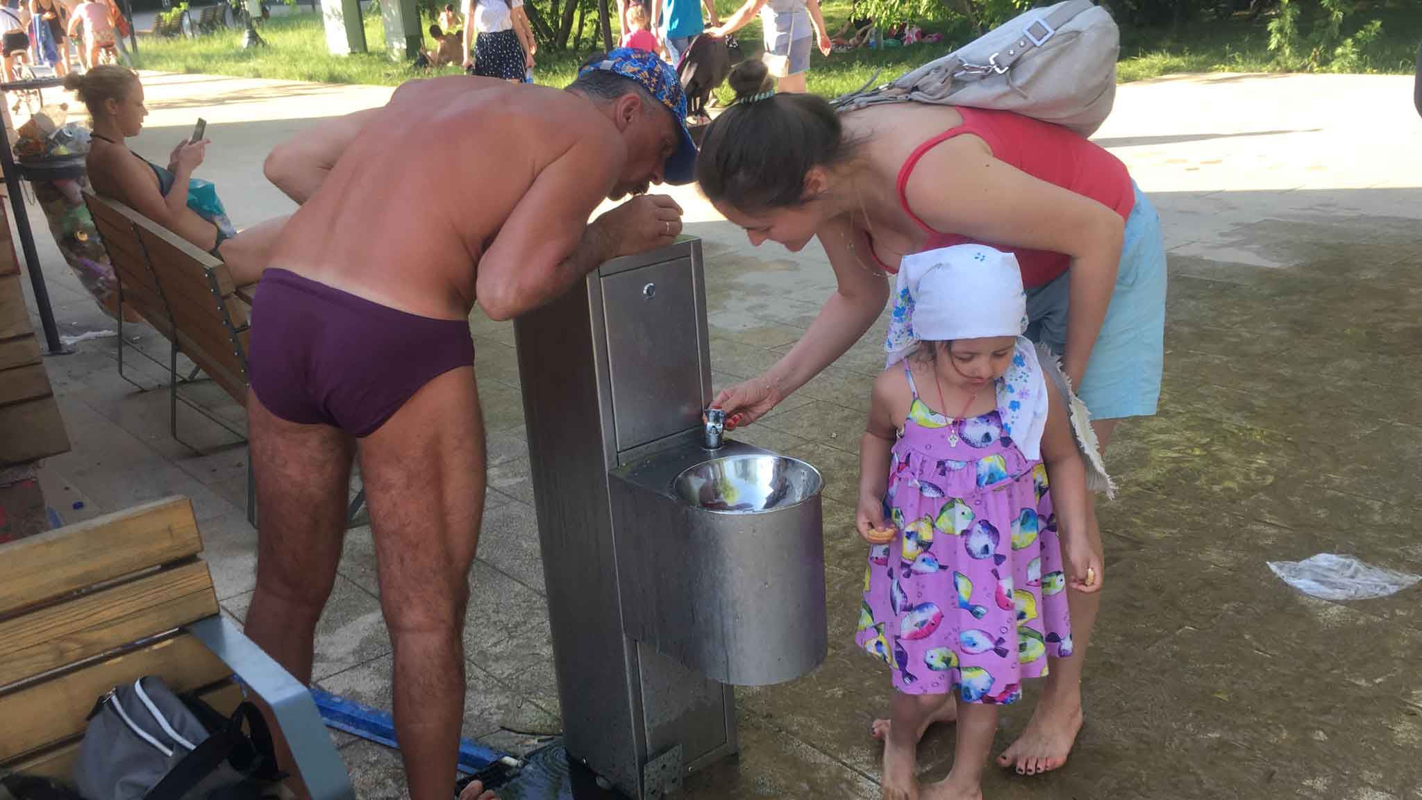 На пляже установлен питьевой фонтанчик с чистой и прохладной водой.