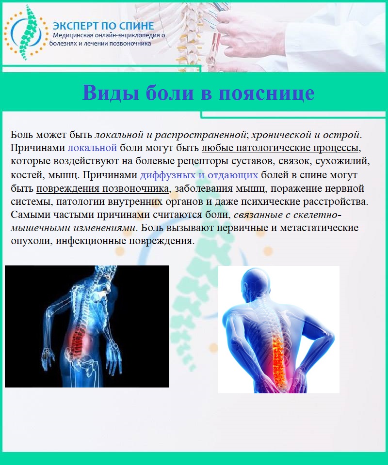 На поясничную область проецируются жизненно важные органы, такие как почки и мочеточники. Этот факт следует учесть при наличии болей в поясничной области, поскольку боль может быть связана с патологией внутренних органов. Иннервируют поясничную область ветки мощного поясничного сплетения и ветки крестцового сплетения, нервные окончания которых достигают нижних конечностей. С этой особенностью иннервации связаны отдающие в нижние конечности и в паховую область боли.