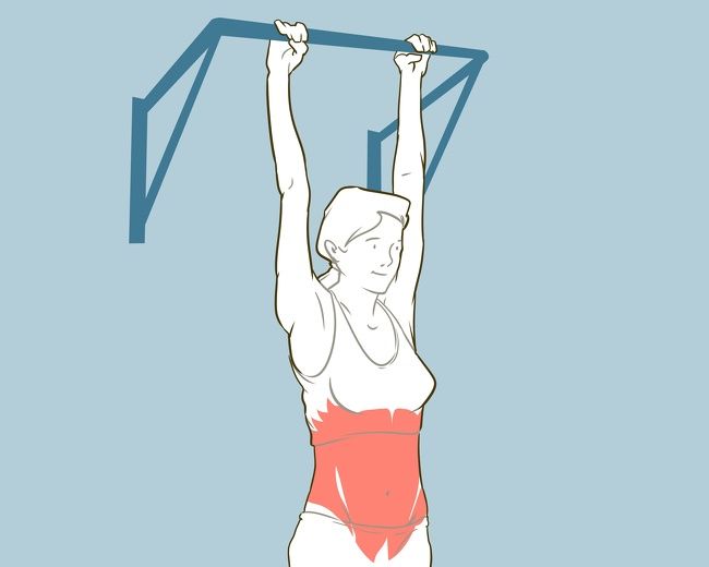 Вис на перекладине (турнике) при использовании силы рук помогает растянуть мышцы тела. Чтобы добиться лучшего эффекта, выполните несколько подтягиваний.