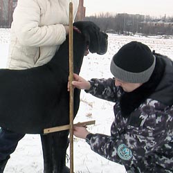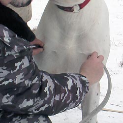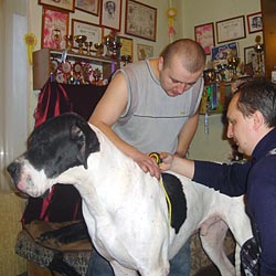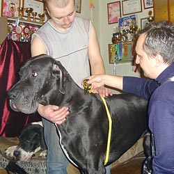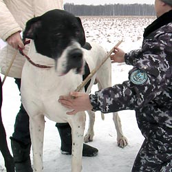 Мы часто спорили по поводу своих собак — у кого из них грудь шире, кто ростом выше, кто костяком мощнее… Помочь правильно измерить кобелей и раз и навсегда поставить точку в этих спорах нам предложил ветеринарный врач, преподаватель кинологического центра МЧС, эксперт-судья по рабочим качествам Валерий Леонидович Минаев. Он руководил процессом измерений, помогал правильно определить анатомические ориентиры. Он же любезно предоставил специальный мерный циркуль, без которого некоторые промеры произвести было бы затруднительно, а некоторые — невозможно.