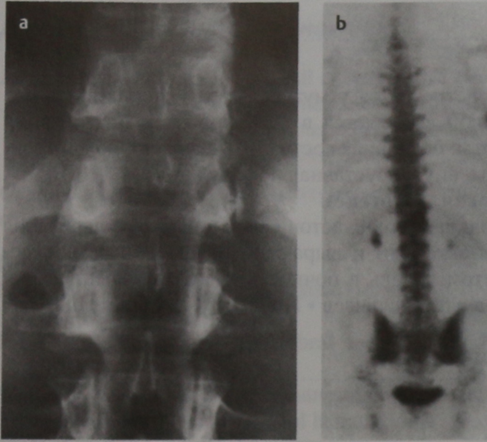 При поступлении больной бледный, худой, обращает на себя внимание резкий сколиоз влево в грудном и поясничном отделах. Значительная болезненность на уровне ТX-ТXII, особенно в околопозвоночных точках. При неврологическом обследовании определяются резкое снижение слева коленного и пяточного рефлексов, гиперестезия в зоне корешков X-XII сегментов спинного мозга. Спинномозговая жидкость и ликвородинамические пробы без особых изменений. Рентгенологически в правом поперечном отростке LI на фоне неравномерного уплотнения костной ткани определяется небольших размеров участок разрежения со склерозом вокруг.