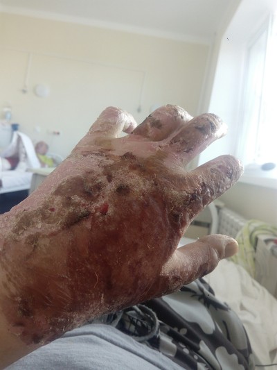 2) Бабулечка 87 лет. От газовой плиты загорелся халат (классика). Глубокие ожоги на предплечье. Казалось бы ничего такого необычного, НО! У бабули кожа как пергаментная бумага+ отеки. Кожа легко рвется от не сильного надавливания на нее. При снятии повязок практически нереально не порезать кожу. Даже при задевании обратной стороной бранш ножниц- появлялись раны. Возился почти месяц. Выполнил 2 операции. Кожа прижилась- выписал. И вздохнул облегченно