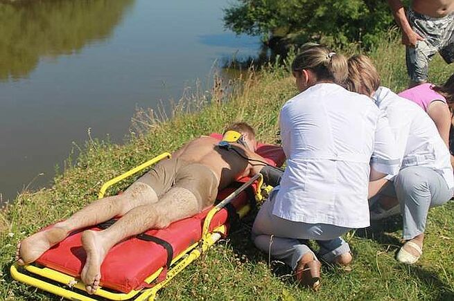 Во время оказания помощи нельзя совершать никаких резких движений. Также проверьте, дышит ли он. Если это так, следует ждать помощи в воде. Если нет, то необходимо вытащить пострадавшего на берег, зафиксировать голову (можно использовать рюкзак, толстовку, полотенце) и начать искусственное дыхание.