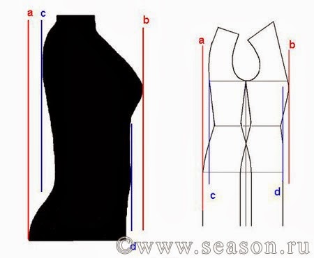 Приступаем к самому интересному - в распечатанных выкройках выбранной модели, промерим основные участки конструкции и учитывая прибавки, о которых говорилось выше, сравним их со своими мерками плюс прибавки.