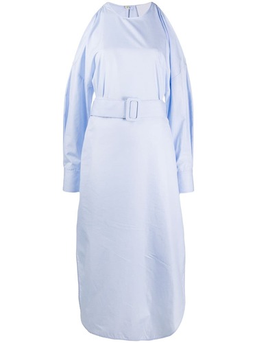Платье миди с открытыми плечами от Erika Cavallini (Эрика Каваллини). Круглый вырез, пояс на талии, прорезь на спине, длинные рукава, манжеты на пуговицах и закругленный подол. Цвет: синий.