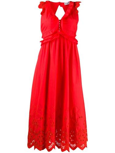 Платье миди с кружевной вышивкой от Self-Portrait. Оборочная отделка, глубокий V-образный вырез, застежка на пуговицах спереди, модель без рукавов, открытая спина, застежка на завязке сзади, расклешенная юбка и закруглённый подол с кружевом. Цвет: оранж.
