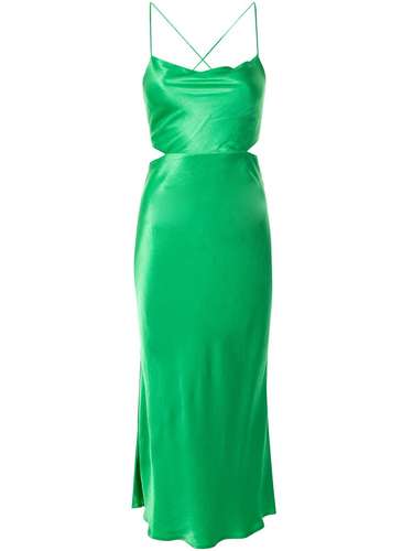 Платье миди Loren с вырезом от Bec + Bridge. Разрез ткани по диагонали, вырез-ковш, тонкие лямки-спагетти, потайная застежка на молнии сзади, перекрещивающиеся лямки на спине, открытая спина и средней длины.