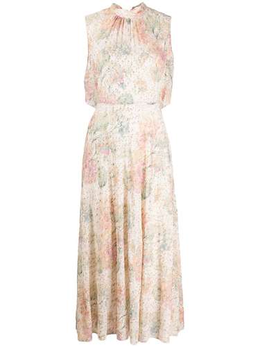 Платье без рукавов с цветочным принтом от REDValentino (Ред Валентино). Воротник-стойка, застежка на завязке сзади, открытая спина, средней длины и расклешенная юбка.