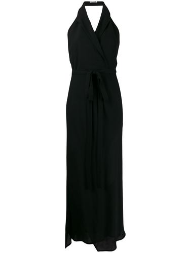 Платье 1990-го года с открытой спиной и запахом от Jil Sander Pre-Owned. V-образный вырез с запахом, талия на завязке, открытая спина, боковой разрез, классические лацканы, асимметричный подол и удлиненная модель. Обратите внимание, что это товар с исто.