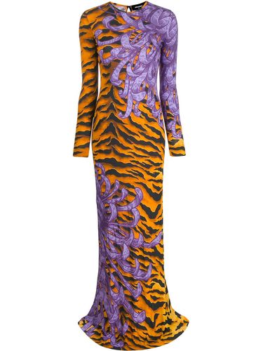 Вечернее платье с открытой спиной от Dsquared2 (Дискуэд). Круглый вырез, длинные рукава, модель по фигуре, удлиненная модель и сплошной узор. Цвет: фиолетовый.