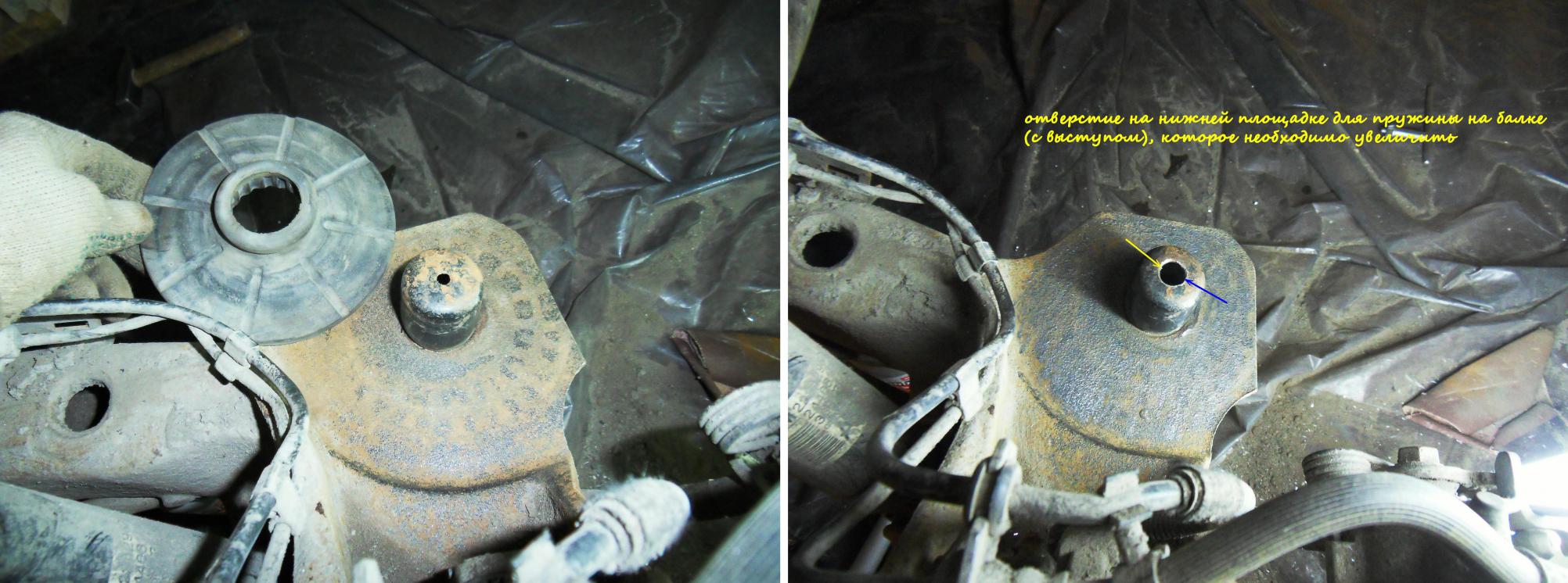 Что касается нижней площадки для пружины на балке, то с резиновой проставкой (бампер, резиновый, рессора к задней оси, нижний) делать ничего не надо. Так как у данного пневмоэлемента ниппель установлен в нижней его части, то требуется только увеличить центральное отверстие в металлическом выступе на нижней площадке пружины как минимум до 20мм (лучше чуть больше, по диаметру шланга с фитингом):