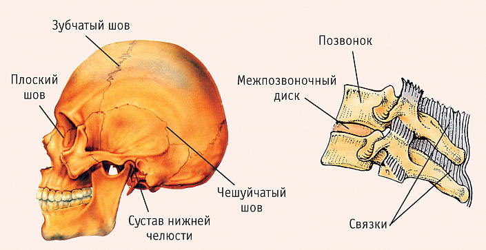 Абсолютное большинство костей черепа соединяются при помощи неподвижных швов. Прилегающие друг к другу лицевые костные образования формируют плоские сочленения, незаметные под тонким покровом мышечного полотна. А височная кость, соединяясь с теменной, дает начало чешуйчатому шву.