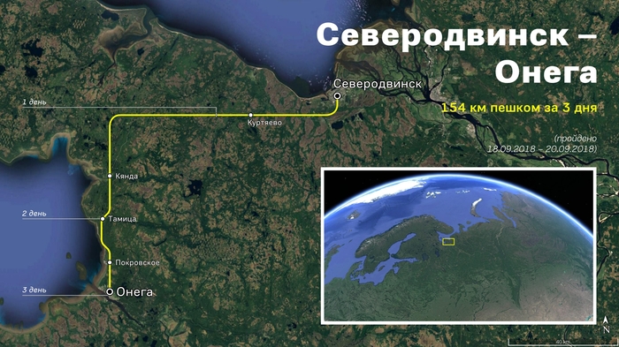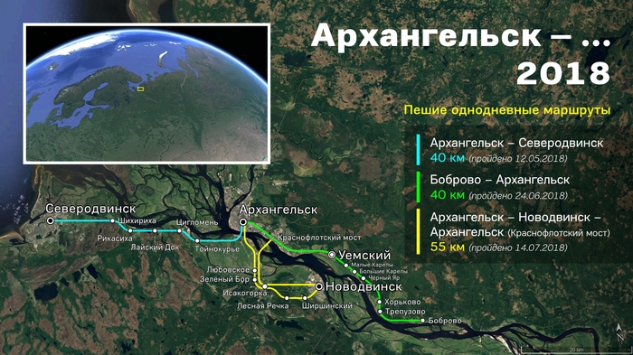 Спустя несколько лет, если не ошибаюсь, это был 2013-й, я совершил два маршрута от Архангельска до Северодвинска и повторил до Новодвинска (40 км и 25 км соответственно), но это были скорее импульсивные поступки, а вот через год вполне осознанно в компании со своей девушкой взял рубеж в 60 км. Теперь на глобусе можно было нарисовать ручкой небольшую чёрточку и сказать, что это было пройдено на своих двух.