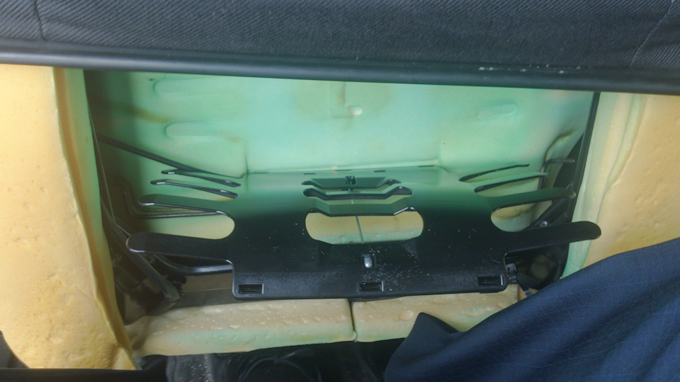 Под цифрой 1 в самом низу спинки кресла пластиковая длинная защелка. Синем выделен профиль, чтобы было понять как он разбирается. Нижнюю часть тащи вниз и чуть на себя (если ты сидишь за водительским сиденьем).
