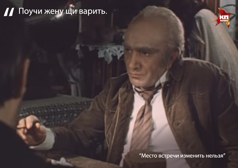 Эх, сейчас бы супчику горяченького да с потрошками, а?! Шарапов, не отказался б ты от горяченького супчику да с потрошками? — Я б сейчас с большим удовольствием бы щец навернул! Жеглов, Шарапов.