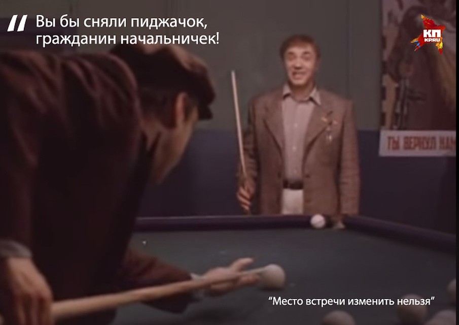 По полкосой скатаем. — Да ты что, Копченый, с Жегловым по полсотни играть?! — А по сколько? — По тыще. — По куску. — По куску. Копченый, Жеглов.