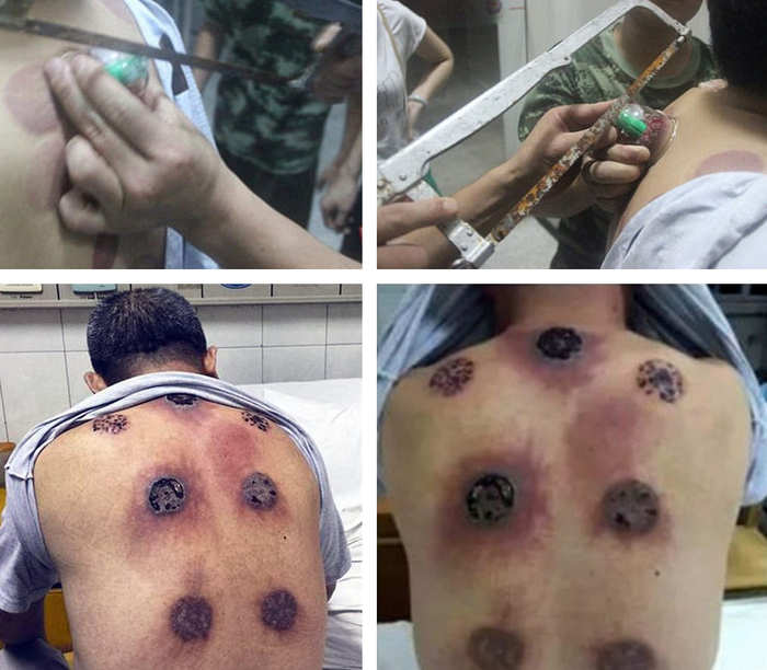 Мужчина целый месяц исправно ходил на процедуры. После десяти дней в местах, куда крепились банки, вспухли волдыри. Не смутившись, Ли попросил жену проколоть пузыри и натереть пораженные места маслом. А за два дня до окончания процедур бедняга слег с высокой температурой. В больнице на спине Ли обнаружили несколько самых настоящих дыр!