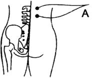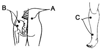Метод лечения: установите электрод на самом больном месте в указанные пары точек А, задайте режим массажа 1 и 2, каждый продолжительностью по 30 мин; если боль в ягодице, установите электрод на самом больном месте ягодицы, в указанную пару точек В, задайте режим массажа 1 и 2, каждый по 20 мин; если боль в нижних конечностях, то установите электрод на месте по С, задайте режим массажа 1 и 2, каждый по 20 мин.