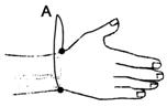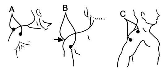 Метод лечения: как показано на рисунке: определяются 3 места боли - А, В, С, больное место ( А или В или С) лечить 30 мин. Режим массажа 2 и 1.