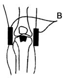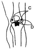 Метод лечения: установите электроды, как указано на рисунке, на места С, режим массажа 1 и 2 отдельно лечить по 30 мин; при воспалении по краю чашечки установите электроды по рисунку на места D , выберите режим массажа 1 и 2, лечить последовательно по 30 мин;