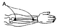 Метод лечения: установите электроды на местах А, как показано на рисунке, задайте режим массажа 1 и 2 по 30 мин. каждый.