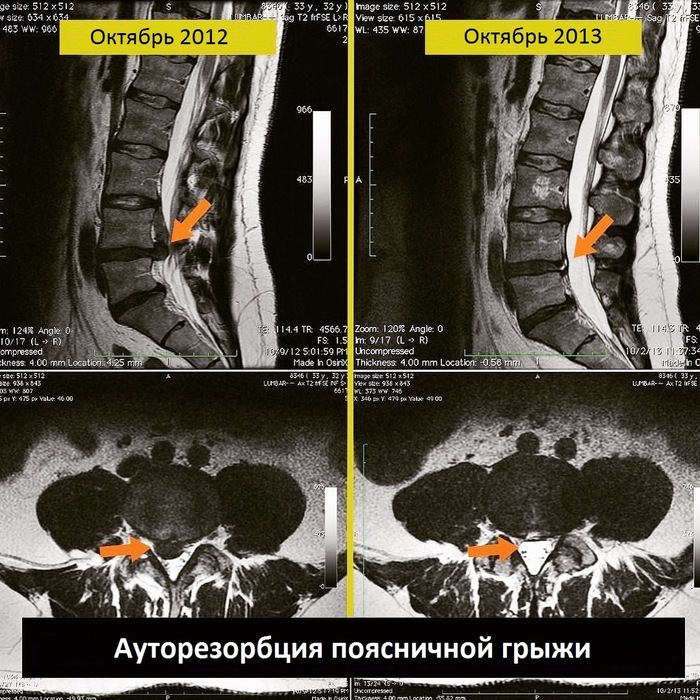 2. Грыжи могут исчезать со временем при консервативном лечении. Это называется ауторезорбцией грыжи. Механизм этого процесса до конца не изучен, предполагается участие макрофагов в локальном воспалении и резорбции. Детали реабилитации этого человека также неизвестны, но важно знать, что относительно простые программы, включающие такие движения, как ходьба, упражнения на подвижность нижней части спины и силовые упражнения с низкой нагрузкой, помогают большинству людей. Ну и определённый запас терпения тоже важен (до 4-6 месяцев).