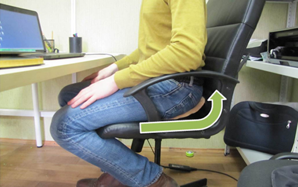 У человека, сидящего на обычном стуле, поясничный изгиб – выпрямляется. Происходит смещение оси центра тяжести вперёд