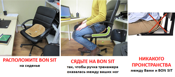 Вы можете поставить тренажер на стул, кресло или табуретку и просто сесть на него. Конструкция тренажера обеспечивает правильную работу мышц у любого человека. Когда вы садитесь, он приводит позвоночник в положении, заложено в нас природой, со всеми природными амортизирующими изгибами. Всего несколько минут, и вы почувствуете, как самопроизвольно без каких-либо сознательных усилий с вашей стороны ваши плечи разворачиваются, и спина выпрямляется. Это происходит на рефлекторном уровне – тело само знает что делать. Чтобы ощутить собственную грациозность, теперь не требуется тратить время на специальные тренировки. Это может происходить в любом месте – где Вы обычно сидите. Исключением, по соображениям безопасности, является движущийся автомобиль.