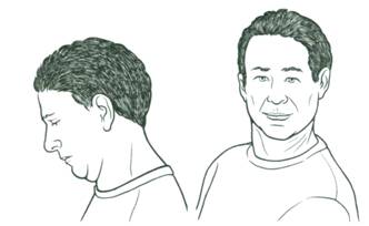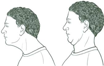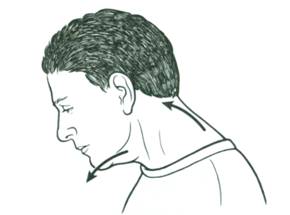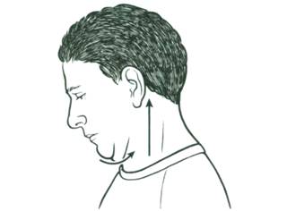 - Сидя на стуле и держа спину ровно, наклонить голову к груди и стараться прижаться к ней подбородком, а уголки рта следует тянуть вверх. Удерживать данное положение около пяти секунд.