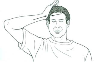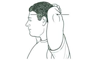 - Стать прямо, ладонь положить на ухо, наклонять голову, давя на ладонь, одновременно делать усилие рукой, не допуская наклона головы к плечу.