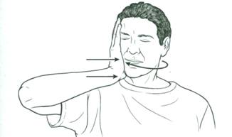 - Лечь на спину, взгляд в потолок, руки расправлены по бокам и расслаблены. Нижнюю губу направлять в разные стороны, при этом верхняя губа должна оставаться неподвижной. При этом напрягаются верхние пучки шеи и нижняя часть лица.